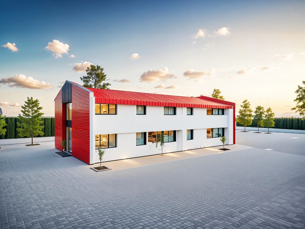 The roof will be a wooden truss system covered with tiles and the façades will be finished in white plaster with red accents. Additionally, an access control and service building will be constructed, with a ground floor and built area of 402 sqm. This secondary building will have a reinforced concrete frame with non-load-bearing masonry and will share the same roofing and exterior finishes as the main building.